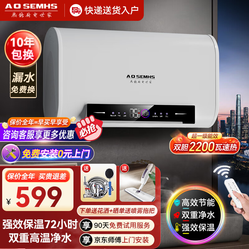 AOSEMHS热水器电热水器家用洗澡储水式2200W扁桶双胆50升一级能效速热BA5022-D02-1 价格:599.00元!
