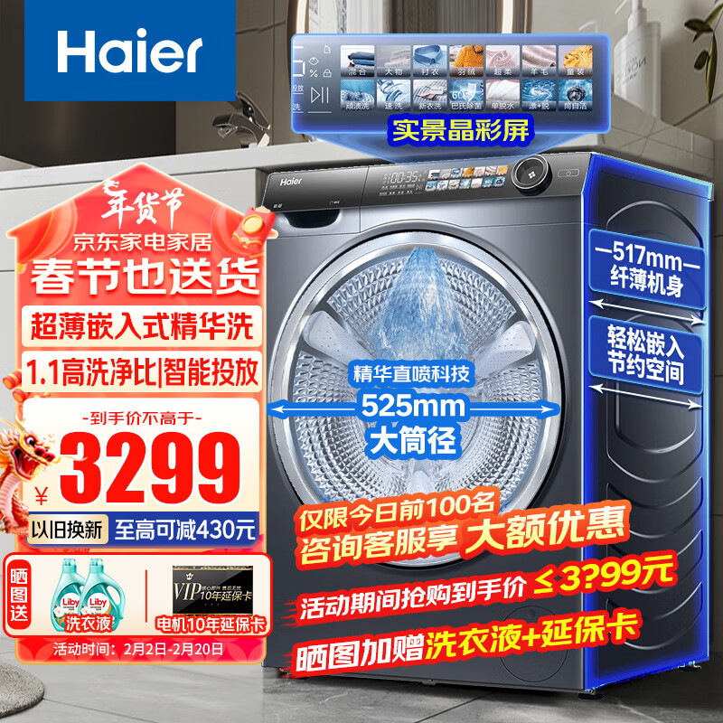 海尔(Haier)洗衣机全自动变频滚筒洗衣机 实景晶彩屏 超薄平嵌大筒径 1.1高洗净比 精华洗直喷科技 智能投放价格:3499.00元!
