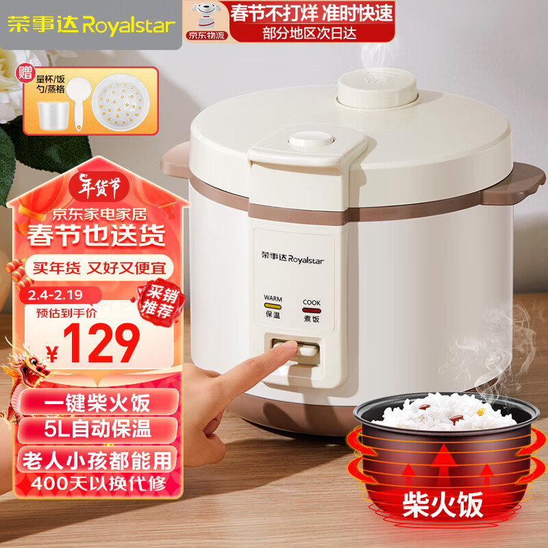 荣事达(Royalstar)电饭煲家用5L不沾内胆微压焖香柴火饭小型迷你多功能一键机械式带蒸笼电饭锅 RX-50V1价格:129.00元!
