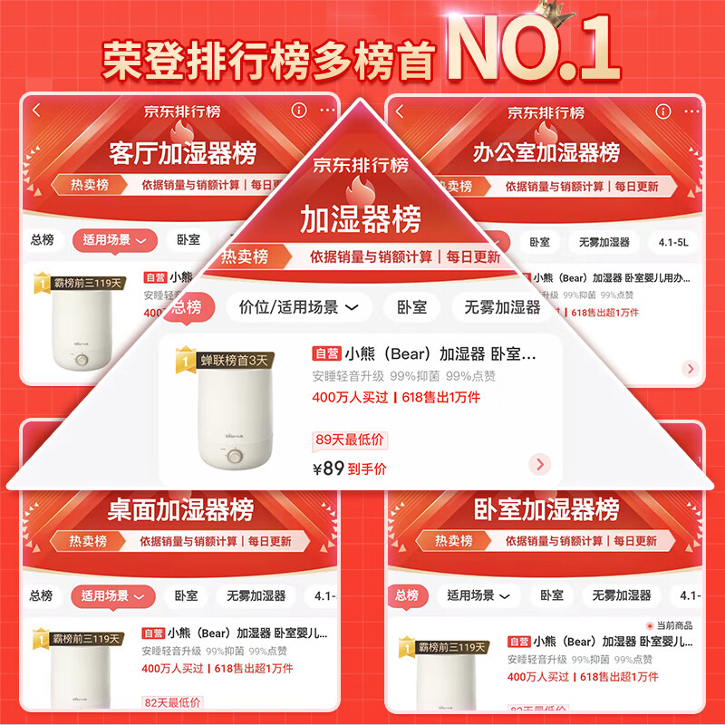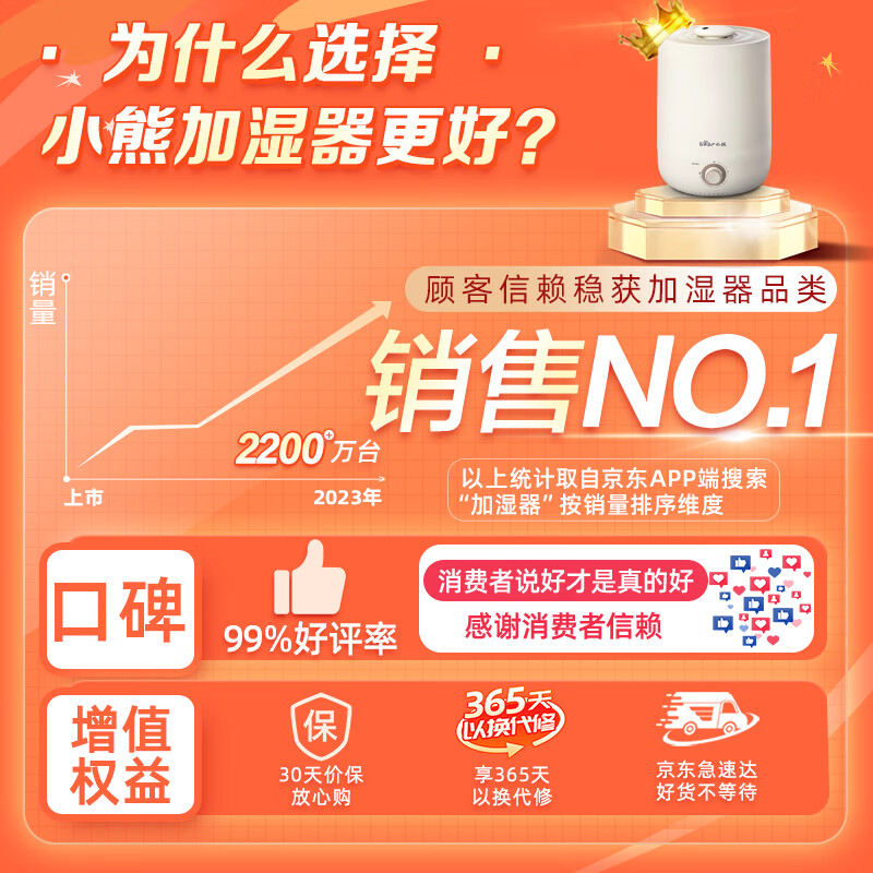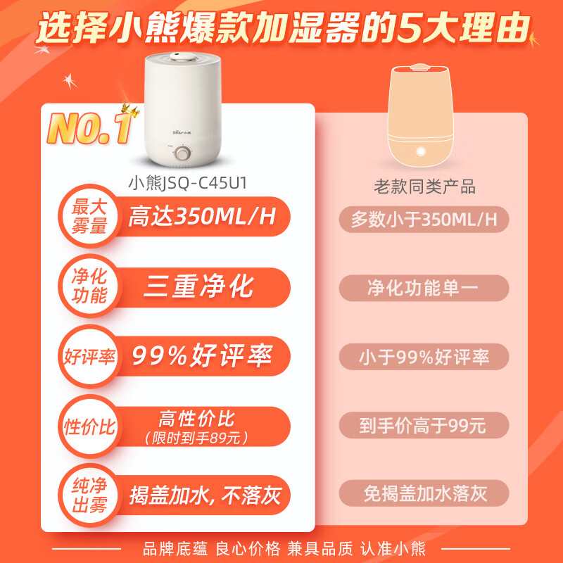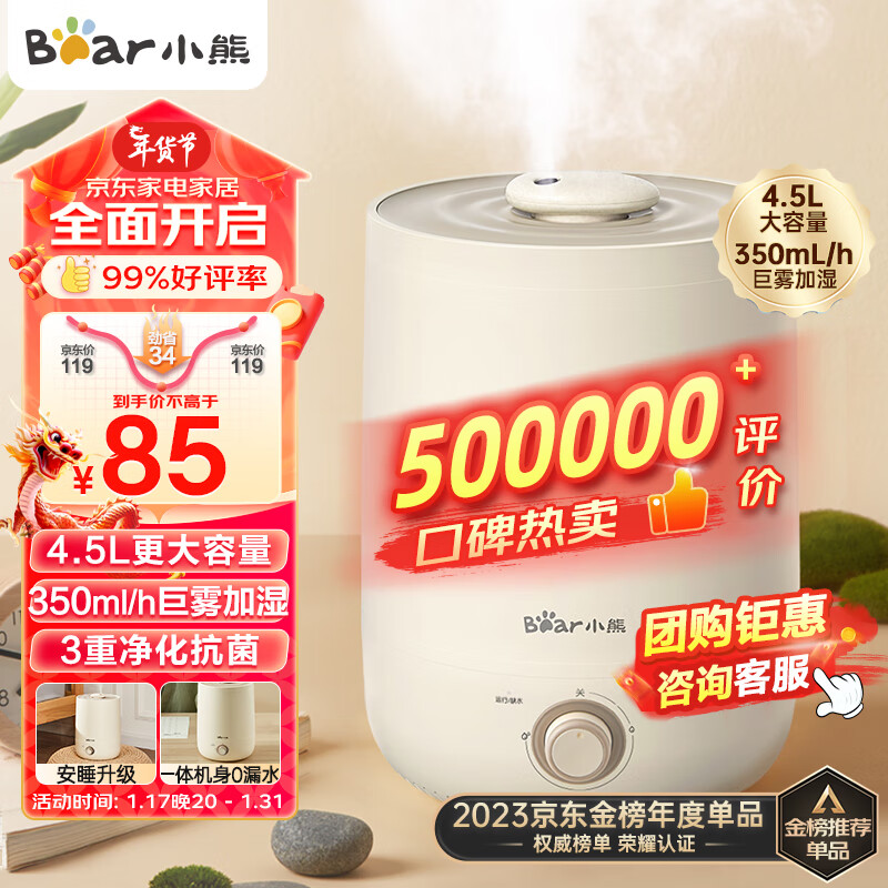 小熊(Bear)加湿器 卧室婴儿用办公桌面大容量 家用迷你低噪大雾量空气加湿净化 银离子上加水JSQ-C45U1 4.5L价格:89.00元!