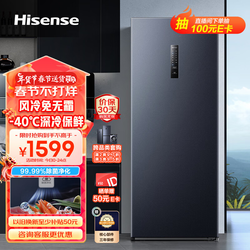 海信(Hisense)159升立式冰柜家用 -40℃深冷风冷无霜除菌冷柜 母乳冷藏冷冻转换 抽屉式单门小冰箱BD-159WVUT价格:1599.00元!