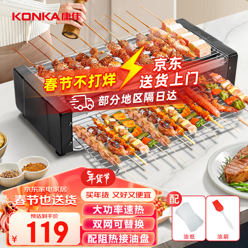 康佳(KONKA)电烧烤炉 烤肉机 家用无烟电烤盘不粘电烤炉铁板烧烤串机烧烤炉 双层烧烤架 KEG-W261C价格:119.00元!