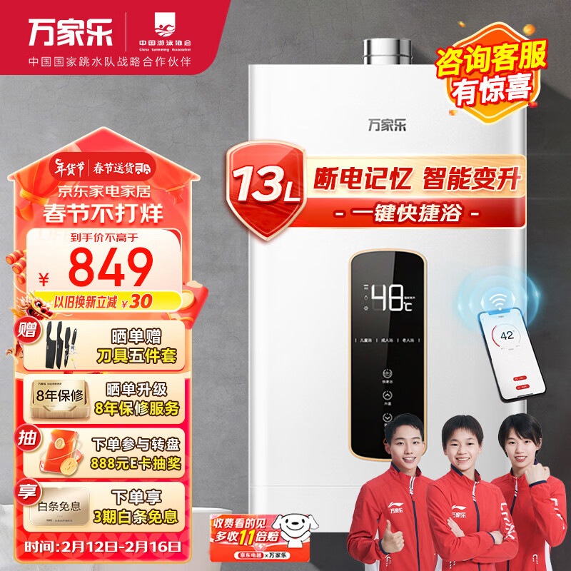 万家乐 13升燃气热水器(天然气)智能变升节能一键智能浴高温防烫锁断电记忆JSQ26-13DP2【主动防冻】价格:849.00元!