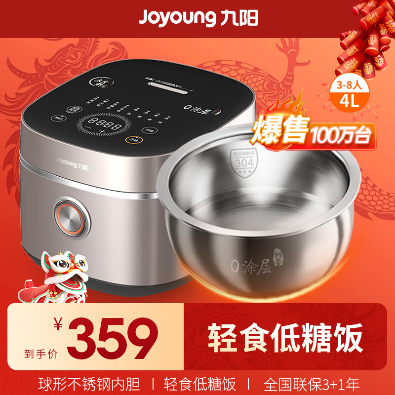 九阳(Joyoung)【0涂层】太空系列4升3-8人无涂层电饭煲电饭锅低糖饭风冷水润膜不锈钢内胆年货送长辈送老人40N3价格:359.00元!