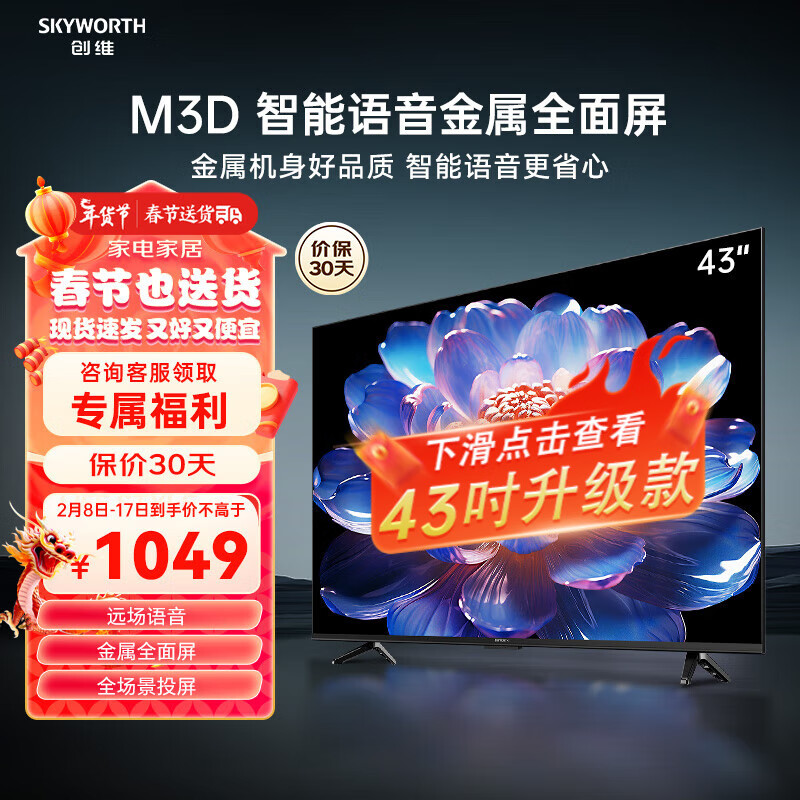创维电视43M3D 43英寸高清智能护眼电视机金属屏三重硬件护眼防蓝光1+8G内存电视 智能投屏43A3D 43英寸声控护眼电视价格:1049.00元!