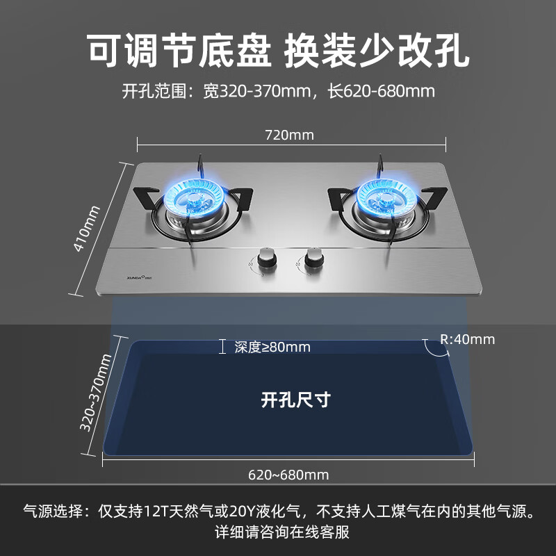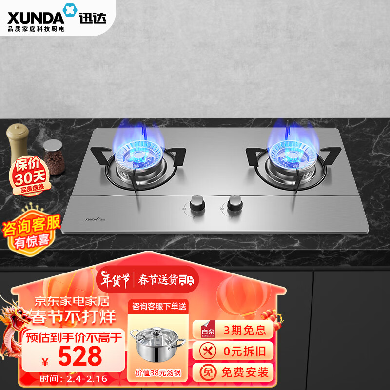 迅达(XUNDA)燃气灶天然气灶家用 双灶具灶台 嵌入式台式两用 4.8KW旋流猛火灶 不锈钢面板 Q1S-天然气价格:578.00元!
