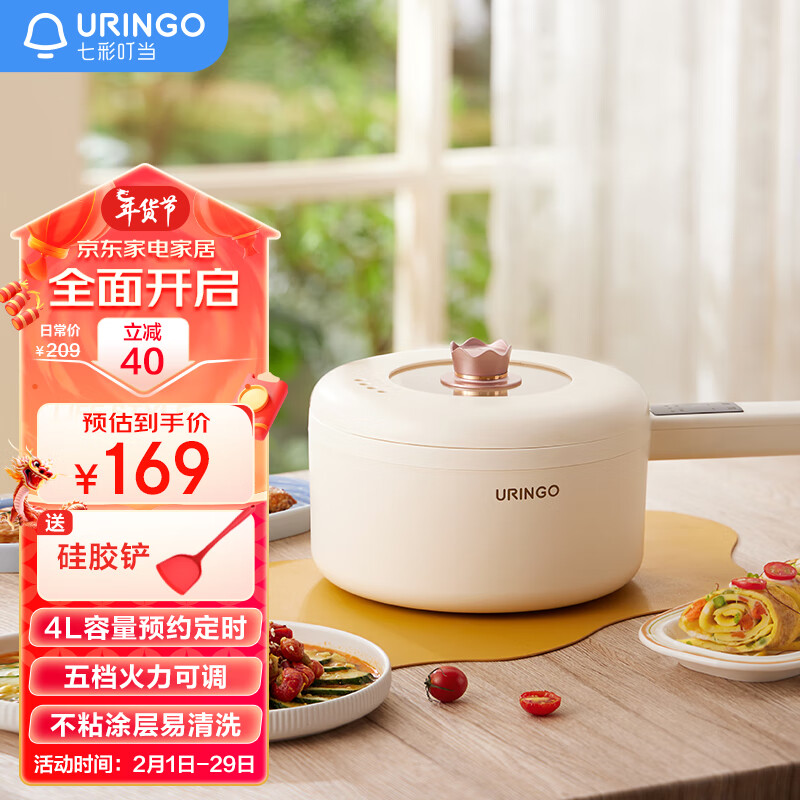 七彩叮当URINGO电煮锅小电锅家用涮锅宿舍小锅电火锅便携式大容量4升多功能锅SD06价格:169.00元!