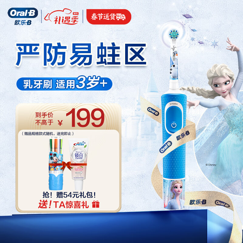 欧乐B儿童电动牙刷 3-7岁乳牙期专用 护齿 乳牙刷 冰雪奇缘款 圆头牙刷(图案随机) D100K kids 日常清洁价格:229.00元!