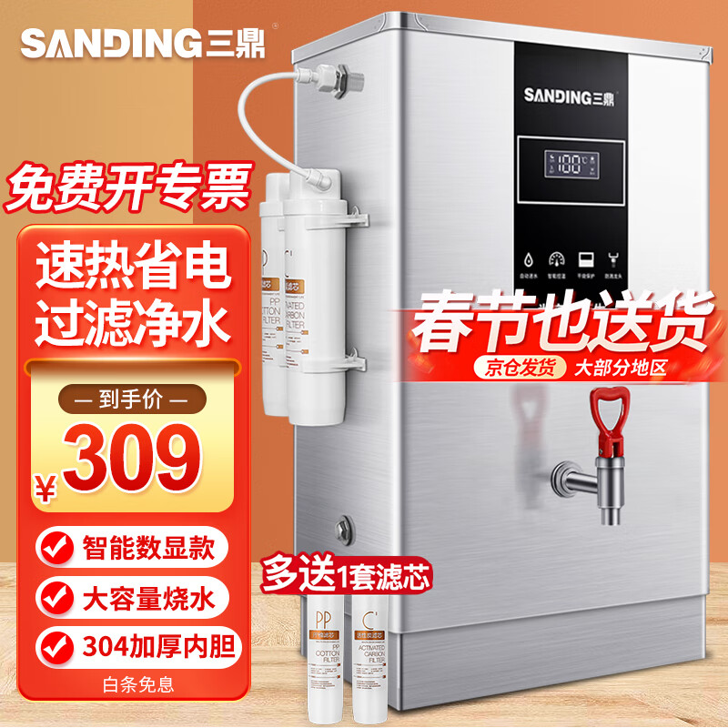 三鼎 开水器开水机商用数显数控烧水器开水桶全自动电热饮水机直饮机30L/h 2kw220v豪华款 二级过滤价格:339.00元!