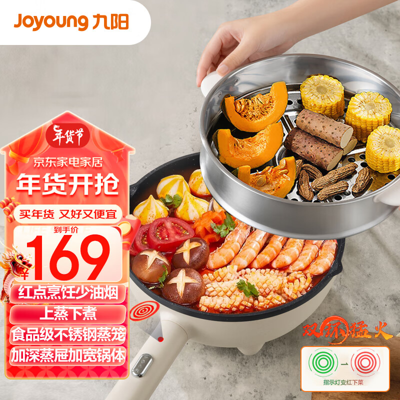 九阳(Joyoung)电炒锅电火锅电煮锅电蒸锅炒菜多用途家用大功率电热爆炒3L年货送长辈送老人HG30-GC30S配蒸笼价格:169.00元!