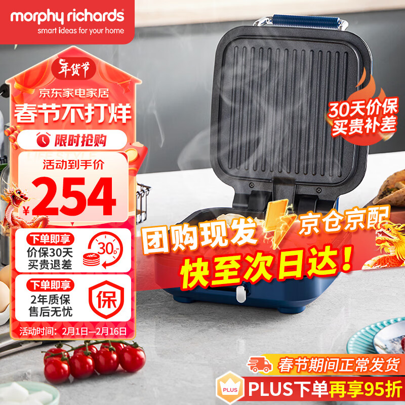 摩飞电器(Morphyrichards)电饼铛 家用双面加热大火力三明治早餐机 下盘可拆卸面包吐司煎烤机烙饼锅 MR8600轻奢蓝价格:254.00元!
