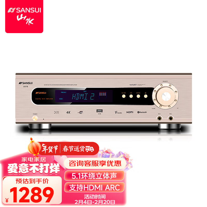山水(SANSUI)ux70 音响功放 音箱 家庭影院5.1声道AV功放机 高保真无线蓝牙家用卡拉ok功放机 峰值1200W价格:1239.00元!