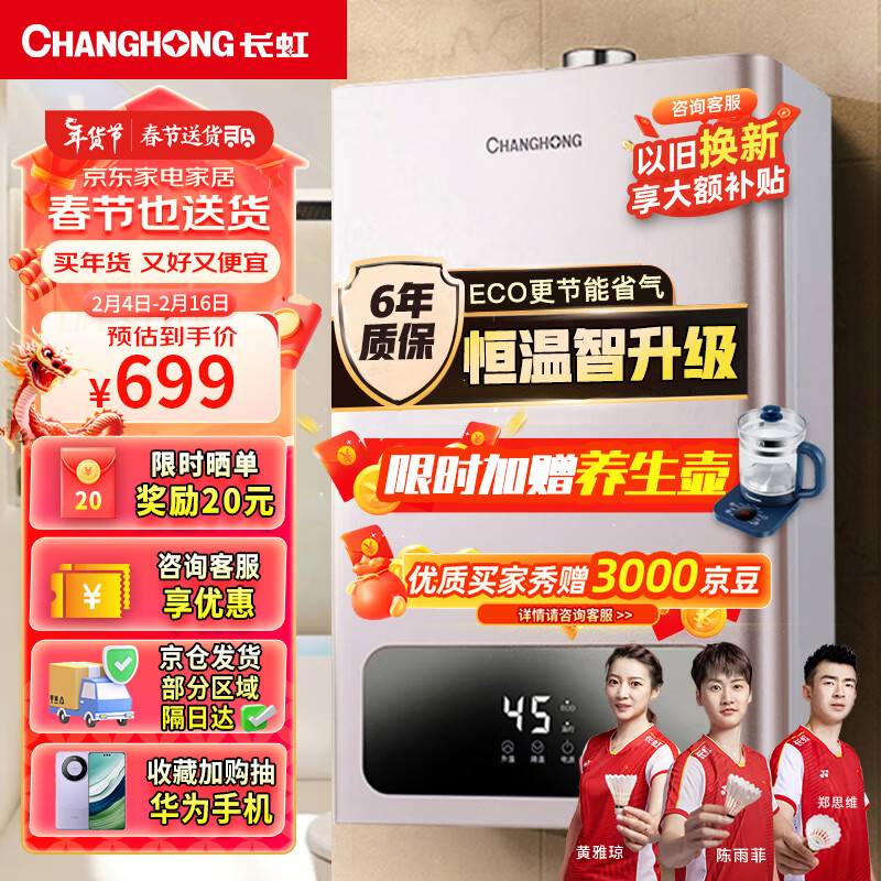 长虹(CHANGHONG)16升燃气热水器天然气水气双调双重防冻3分段燃烧低水压启动恒温天然气热水器16H2S价格:698.90元!