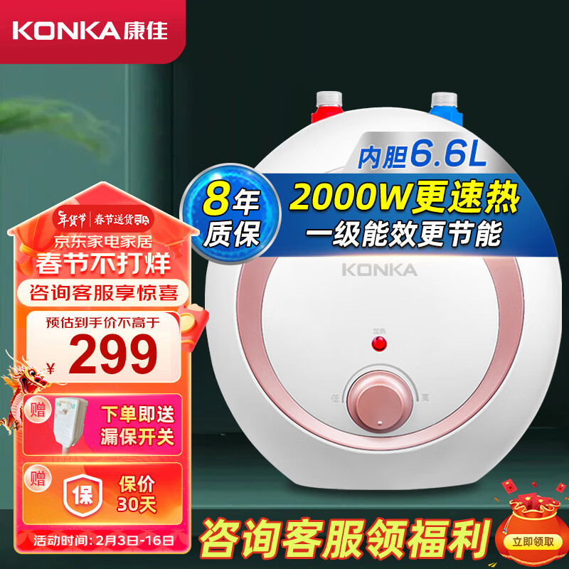 康佳(KONKA)小厨宝 一级能效6.6升家用电热水器 2000W速热节能 小尺寸厨房橱柜安装DSZF-KW02(自行安装)价格:299.00元!
