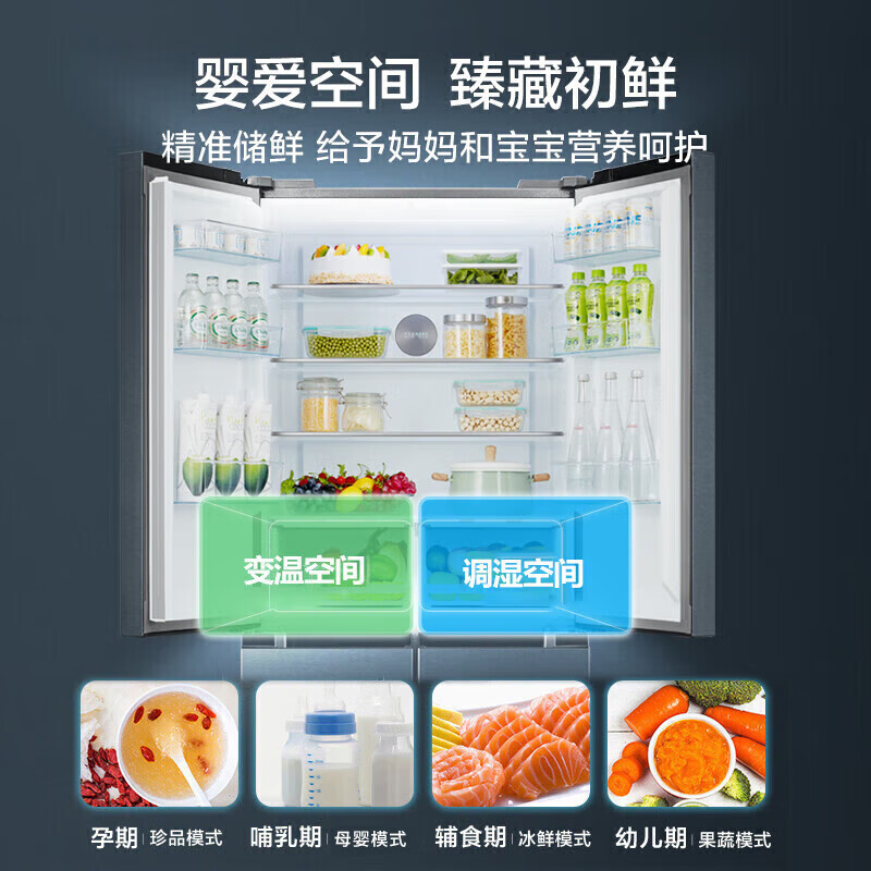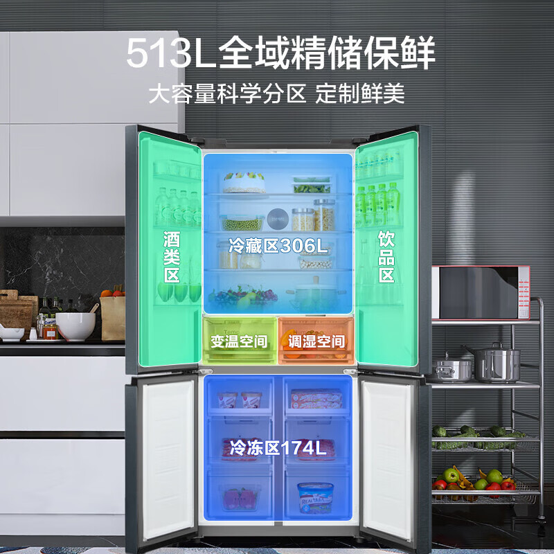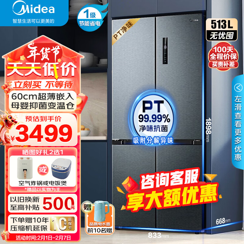 美的(Midea)冰箱513升十字对开门四门冰箱 一级能效 双变频 风冷无霜 家用大容量四门BCD-513WTPZM(E)价格:3698.00元!