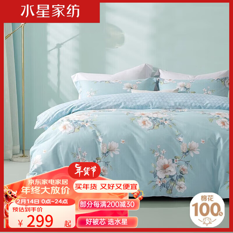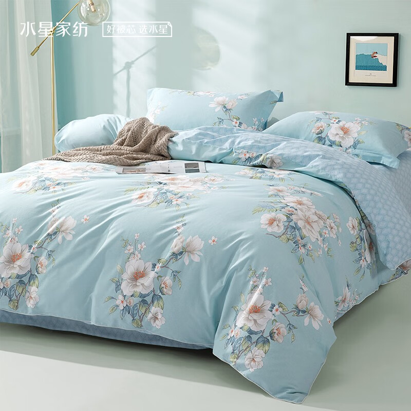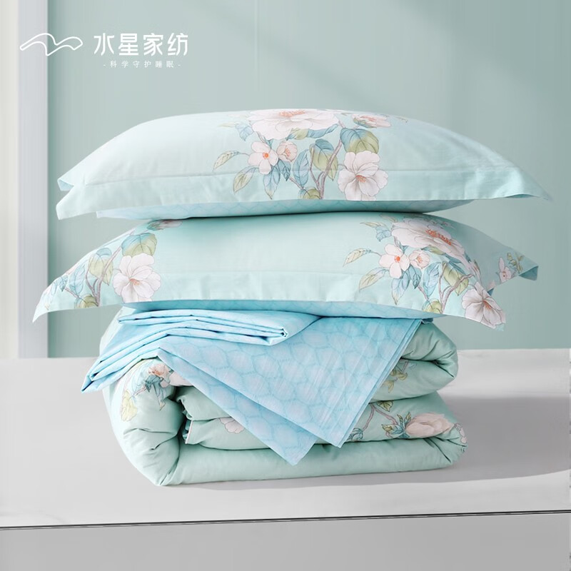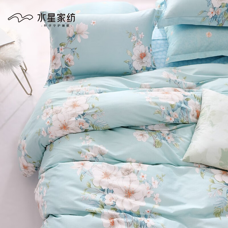 水星家纺 四件套纯棉床单被套枕套 床上用品双人被罩被褥被单学生宿舍床品 斓花逸影【花卉系列】 1.5m床(适配200×230cm被子)价格:479.00元!