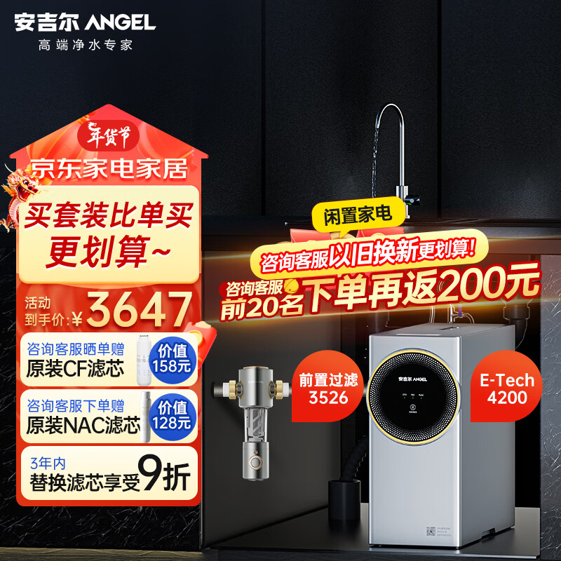 安吉尔净水器家用 全屋净水套装 前置过滤器RO反渗透纯水机套餐 1600G流速体验E-Tech4200+3526价格:3647.00元!