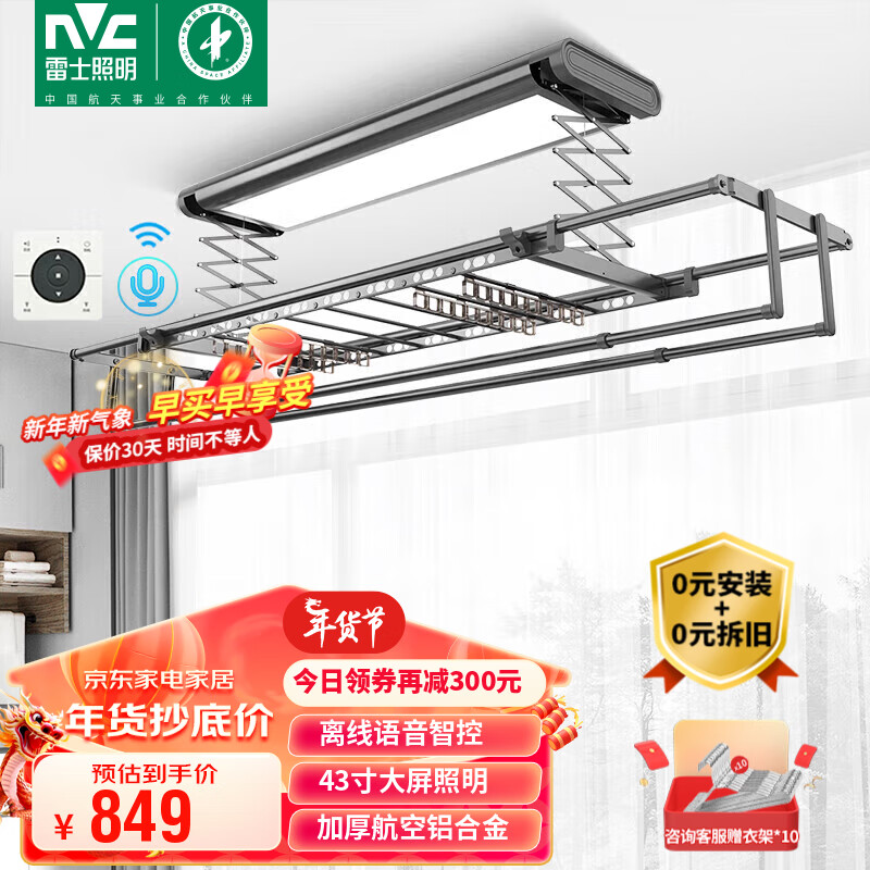 雷士(NVC)电动晾衣架 智能隐形隐藏式阳台晾衣机自动升降晾衣杆晒晾衣架价格:1499.00元!