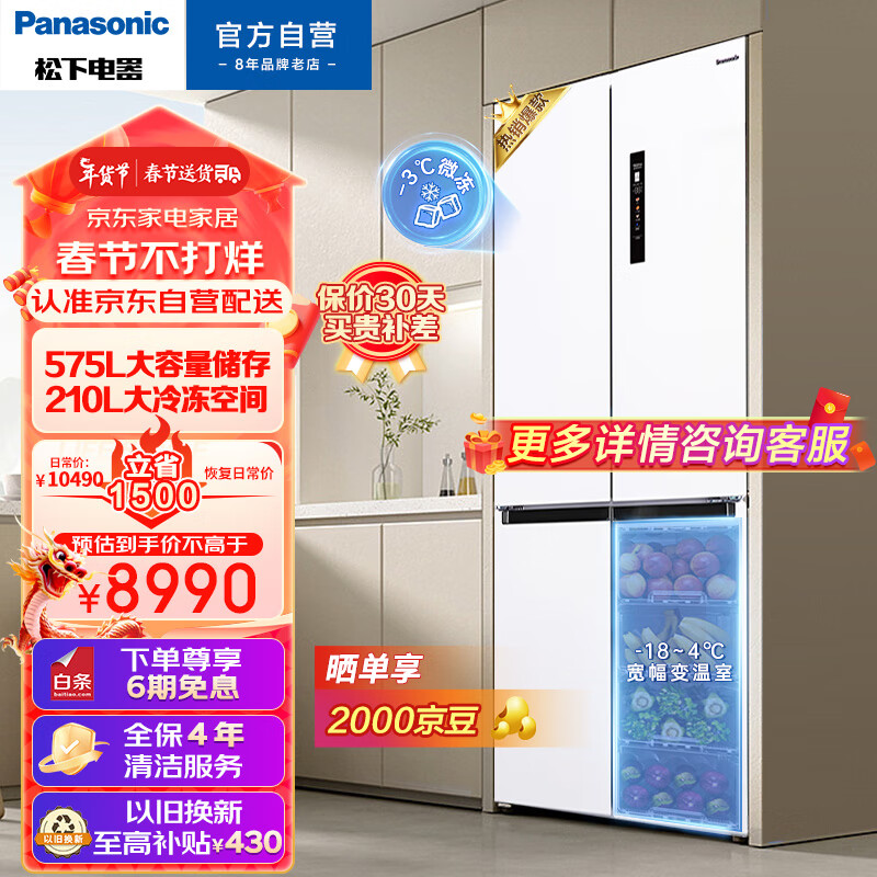 松下(Panasonic)大海豚575升十字对开门冰箱四开门 超薄嵌入式冰箱 干湿分储 一级能效 磨砂白色NR-JW58CMA-W价格:8990.00元!